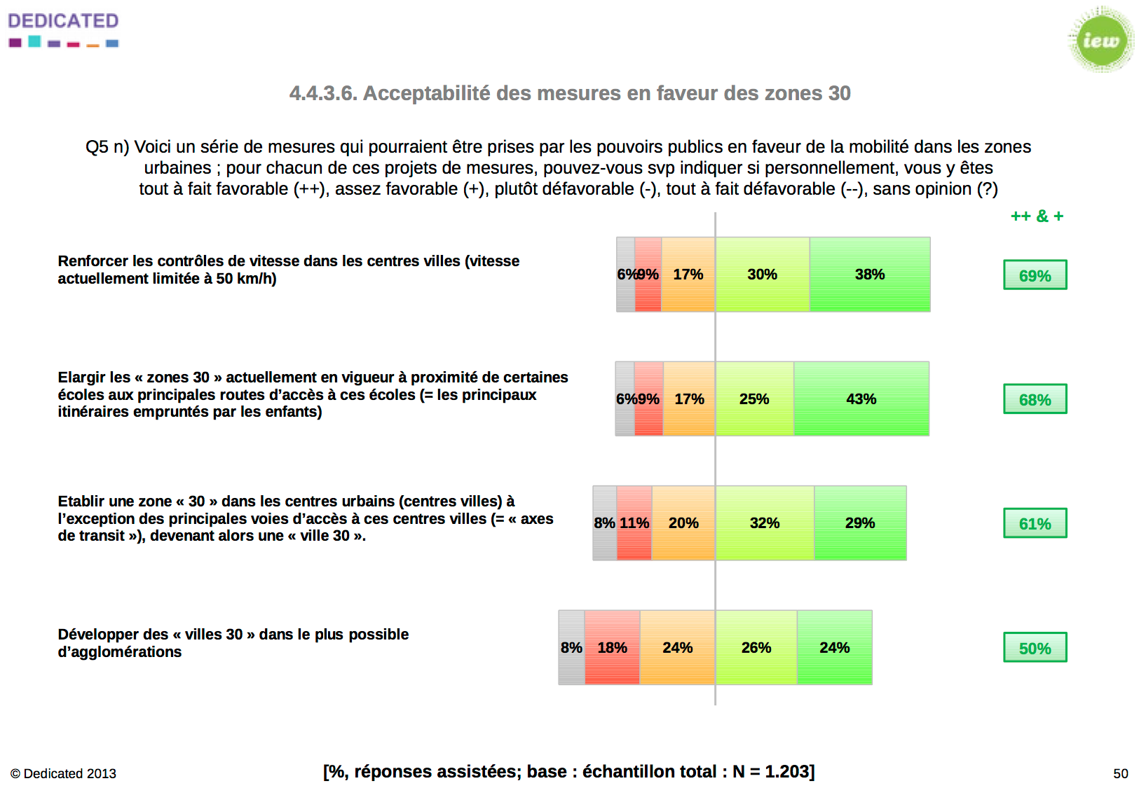 En septembre 2013, Inter-Environnement Wallonie a commandité un sondage à l’Institut Dedicated Research sur la perception des enjeux environnementaux à Bruxelles et en Wallonie. Cette enquête a été l’occasion de poser à 1203 belges francophones de nombreuses questions sur la mobilité, avec un focus particulier sur la “Ville 30″ . Résultat : 61% des personnes interrogées sont favorables à l’extension des zones 30 et 50% sont favorables à leur généralisation à toute l’agglomération.