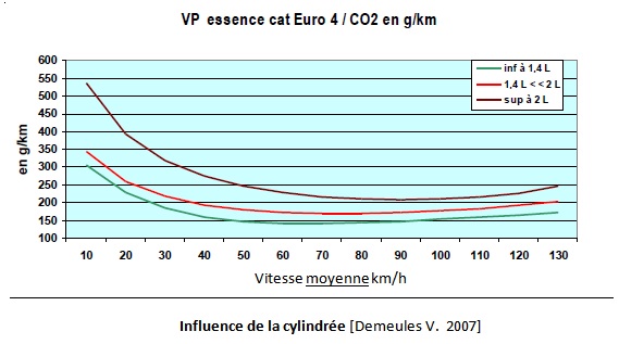 Ces courbes montrent aussi que le type de véhicule peut avoir bien plus d’effet que la vitesse moyenne. Cela ne fait que rappeler que les véhicules lourds et surpuissants sont inadaptés à la ville. L’exemple ci-dessous montre que les voitures de grosse cylindrée émettent environ deux fois plus que les autres.
